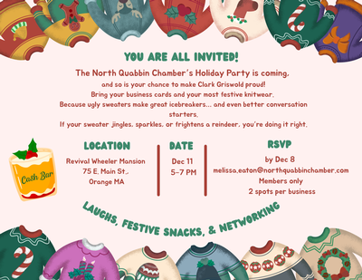 Members of the North Quabbin Chamber of Commerce are invited to join us for a festive Ugly Sweater Holiday Party!