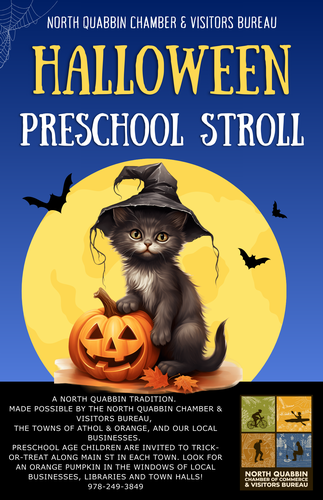 Name: Preschool Halloween StrollDate: October 31, 2019Time: 10:00 AM - 12:00 PM EDTWebsite: https://www.northquabbinchamber.com/Event Description:This fun-filled stroll is a North Quabbin tradition, made possible by the North Quabbin Chamber and Visitors Bureau, the Towns of Athol and Orange, and our local businesses. Preschool age children are invited to trick-or-treat along Main Street in each town and visit local businesses, libraries and town halls which have an orange pumpkin in their windows.